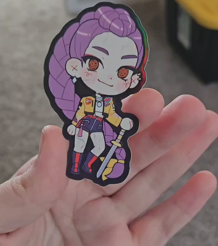 Made with glossy, dishwasher / water / weather / UV resistant holographic glitter vinyl. The borders will be printed in black holographic with details like the girls' weapons and Rumi's markings printed in milky white holographic.