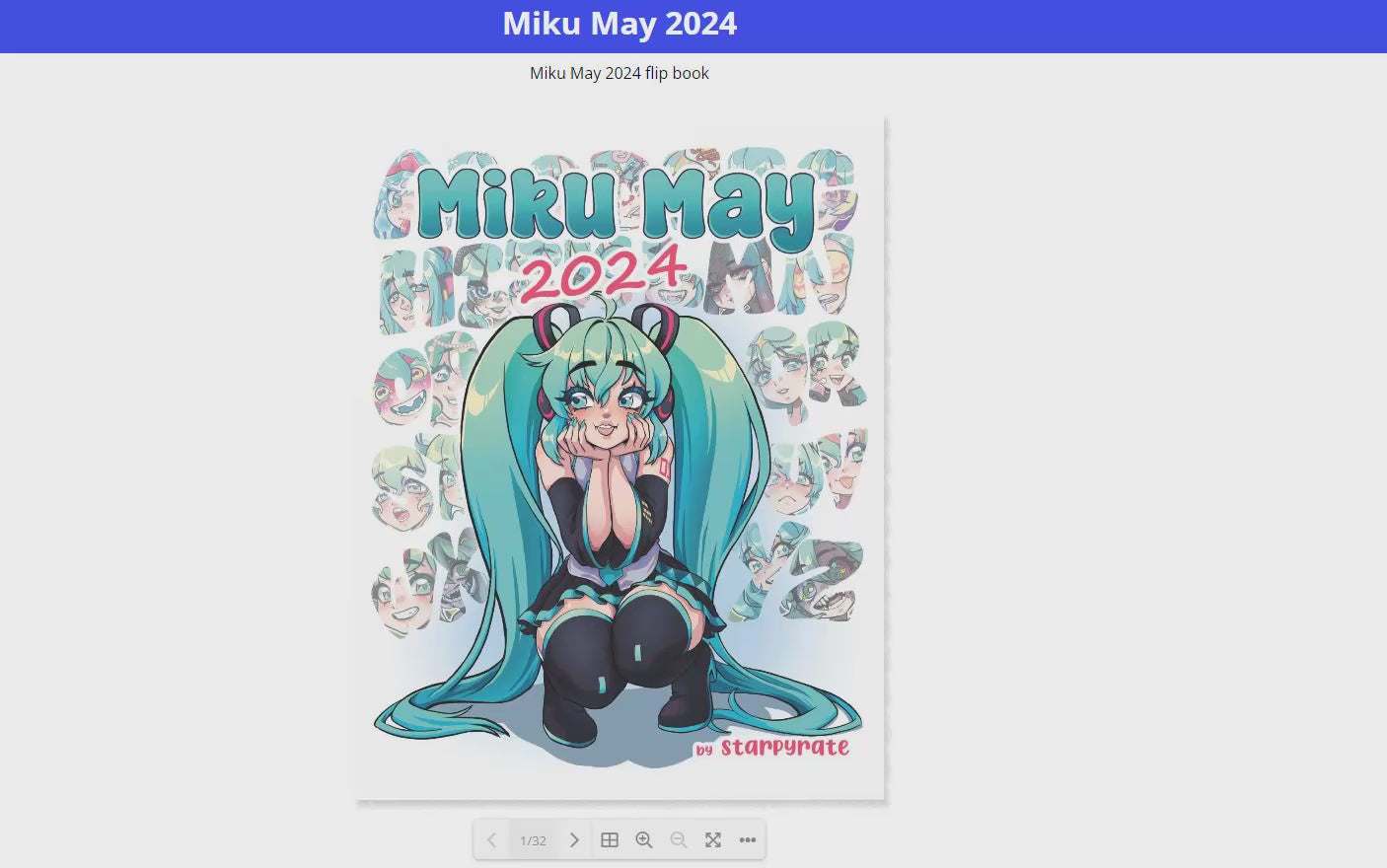 8.5 x 11" 16 page (32 front and back), staple bound zine featuring all 26 designs for StarPyrate's Miku May designs for 2024 - as well as exclusive sketches of the designs AND a 3" vinyl sticker!